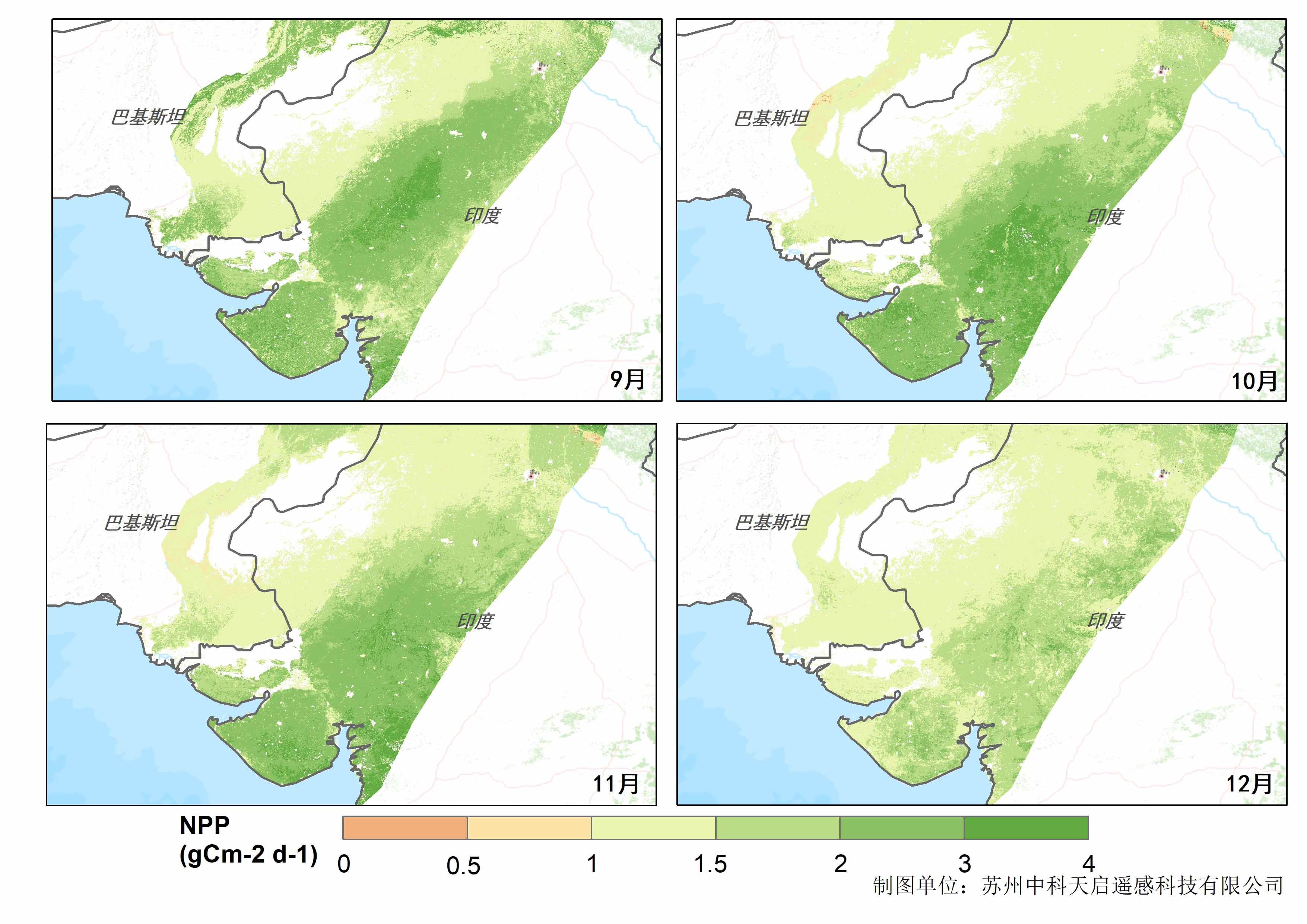 如上图所示2019年9月至12月作物植被净生产力分布区域和强度的变化,下降趋势沿着印巴边境像东西两方向蔓延,表明作物产量的受损变化情况。