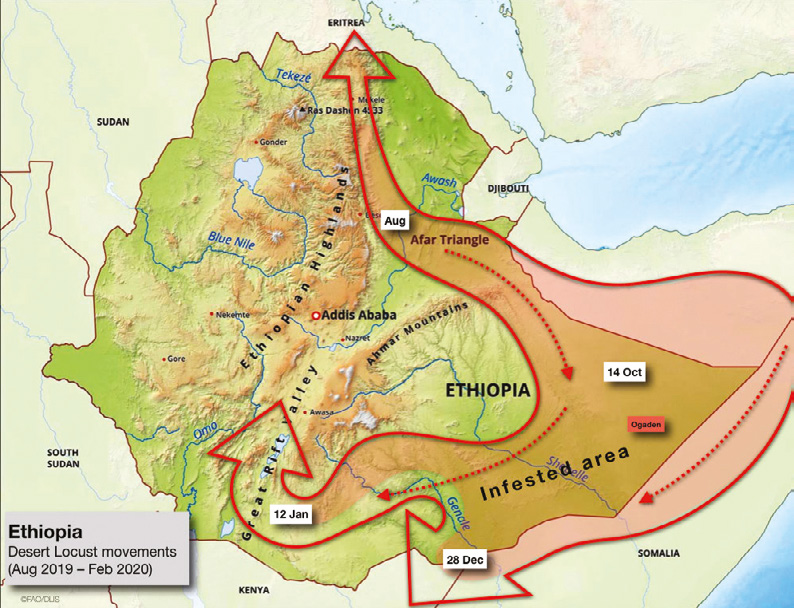 图1 埃塞俄比亚沙漠蝗虫迁徙轨迹(出品:FAO)