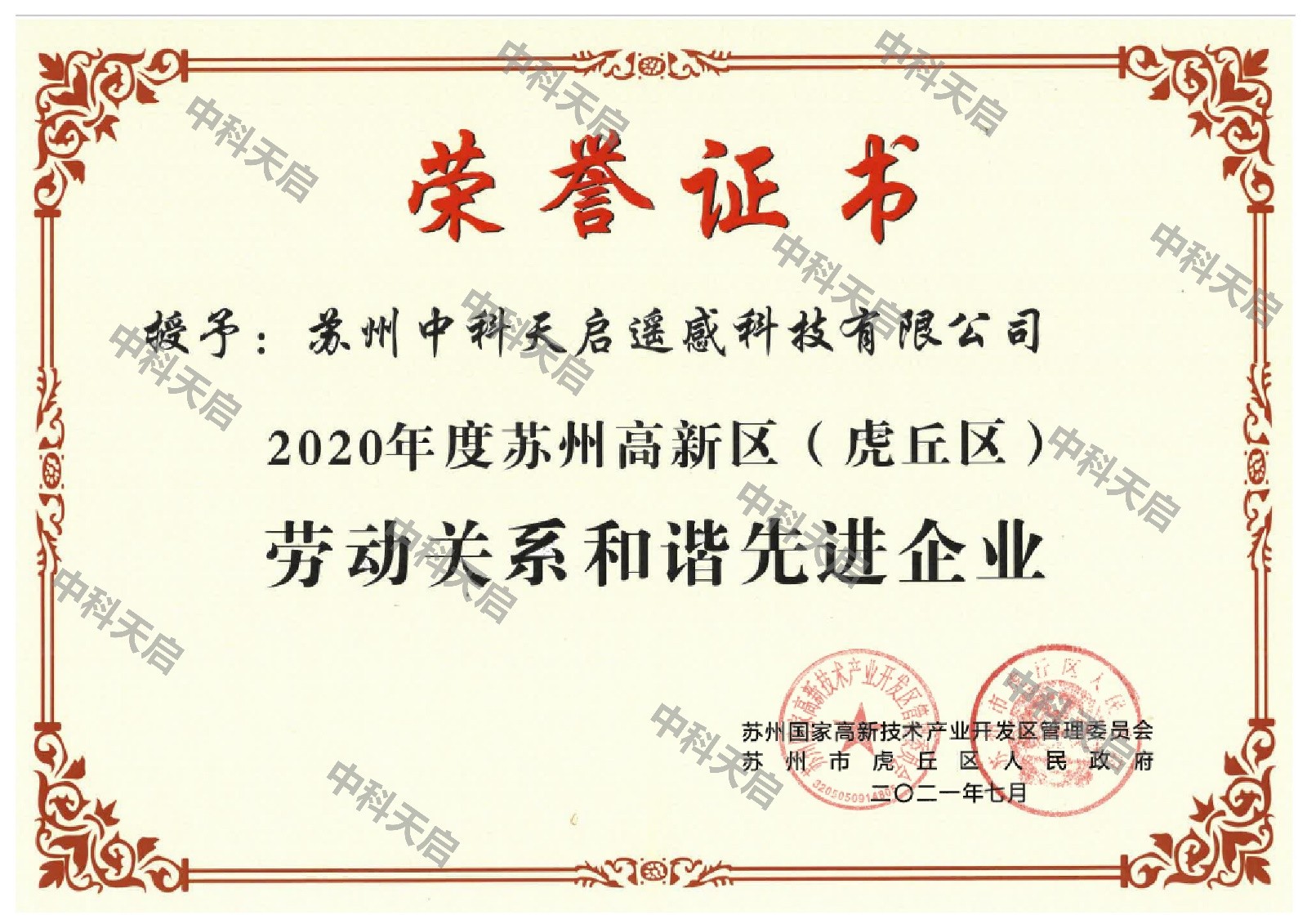 2021年9月17日,在“高新区劳动关系和谐企业座谈会”上,中科天启被授予“2020年度苏州高新区(虎丘区)劳动关系和谐先进企业”的荣誉称号。