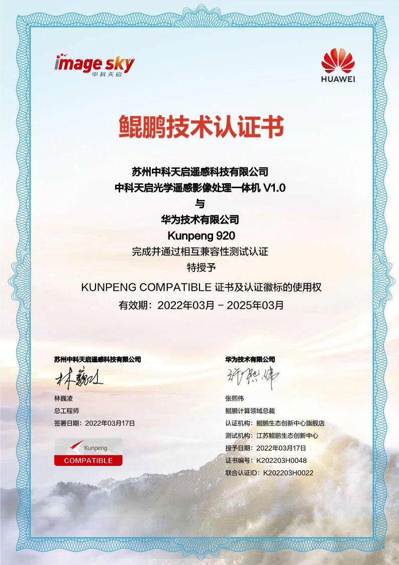 发布时间:2022-03-23 浏览:79082022年3月17日, “中科天启光学遥感影像处理一体机 V1.0”与华为技术有限公司Kunpeng920完成并通过相互兼容性测试认证,授予苏州中科天启遥感科技有限公司KUNPENG COMPATIBLE 证书及认证徽标的使用权。