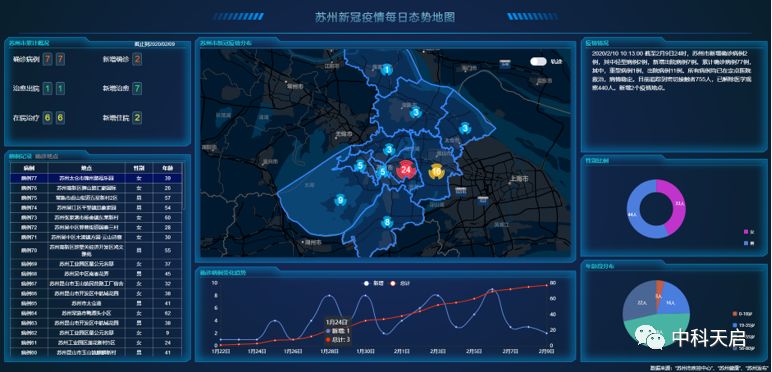 2020年,为了帮助苏州居民理性、客观地了解疫情,中科天启临时组建远程办公小组,发挥地理信息技术优势,整合政府发布的疫情讯息,紧急推出“苏州新冠疫情每日态势地图”,将疫情信息空间化,实时直观展现“三张图”——苏州新冠疫情确诊病例地点分布图、疫情态势图、确诊病例轨迹图。并持续更新与疫情相关数据元素,丰富展现内容,助力疫情阻击。