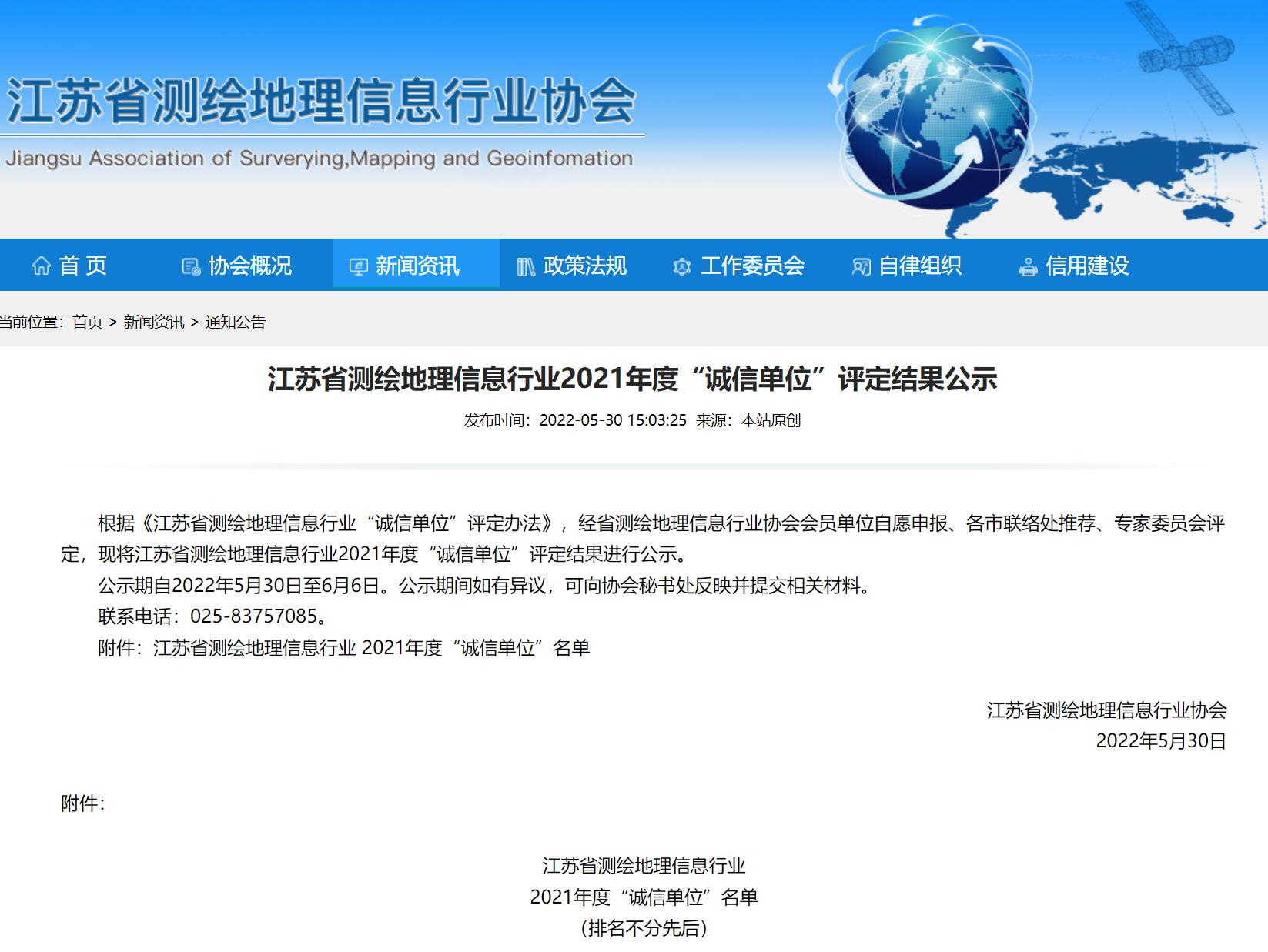 喜讯!中科天启被评为江苏省测绘地理信息行业协会2021年度“诚信单位”