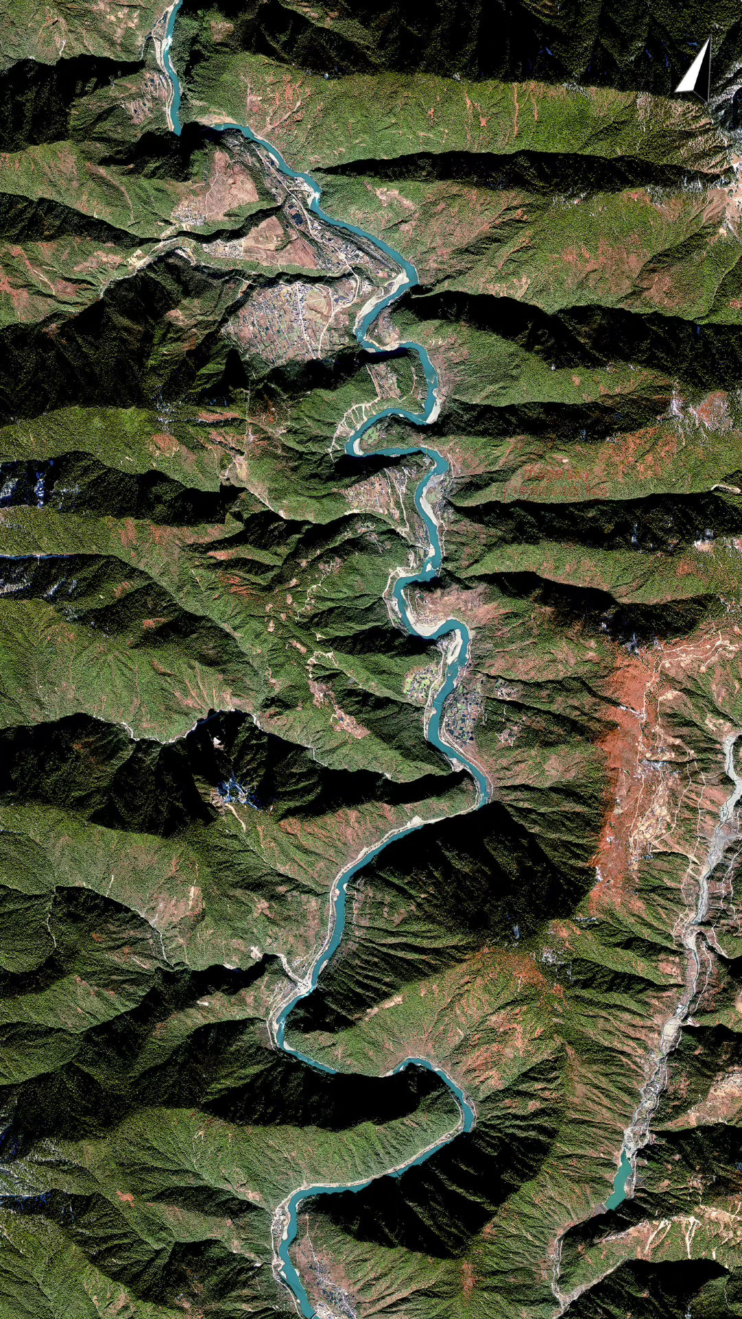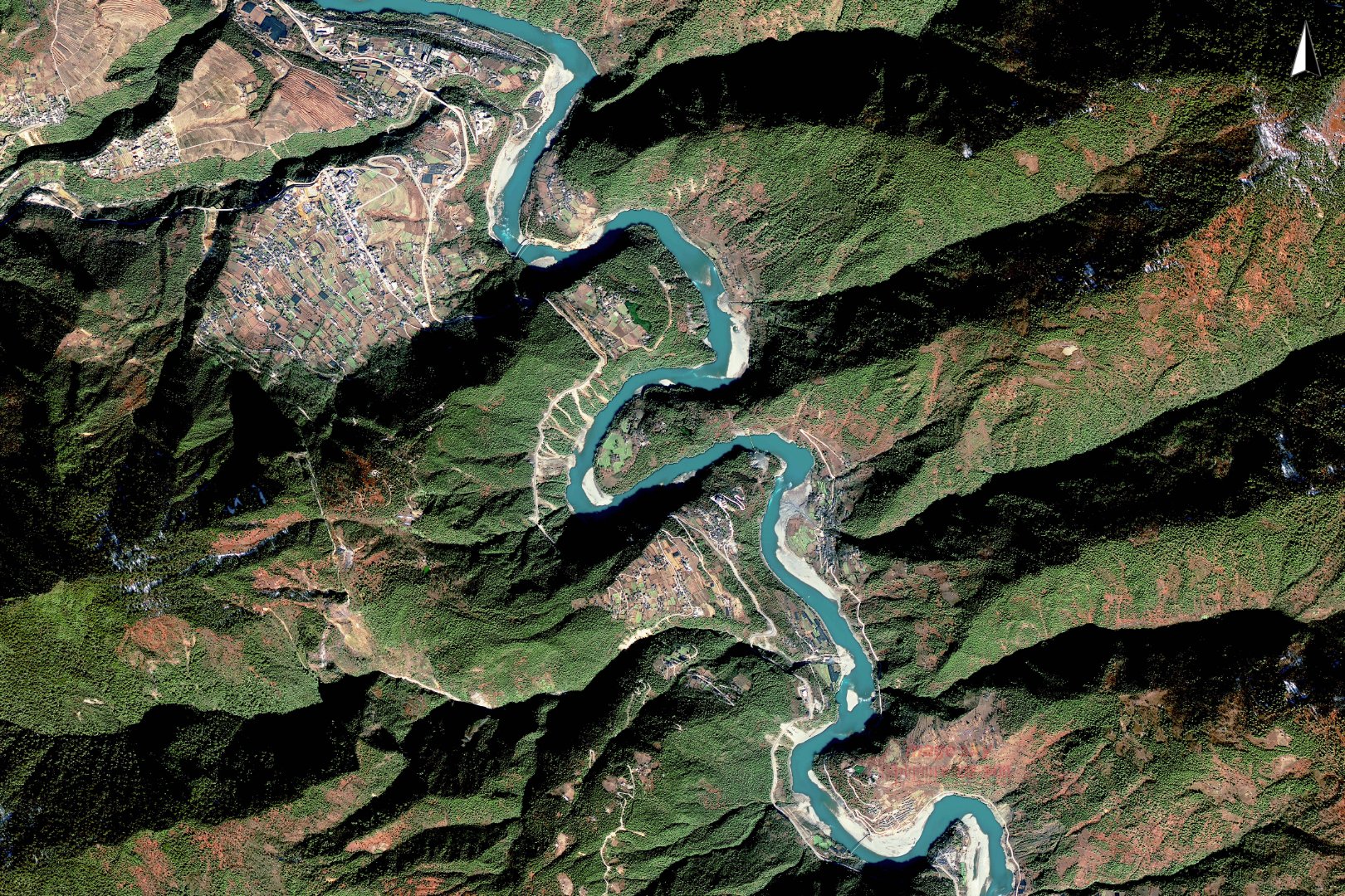 怒江的这个弯转了几乎270度,合围成了一个水滴状的半岛。从遥感影像图中可以看到,围绕半岛的曲流弯曲率非常大,随着河流不断冲蚀,曲流的颈部会越来越窄,最终将被截穿,完成河流自然的"裁弯取直"。
